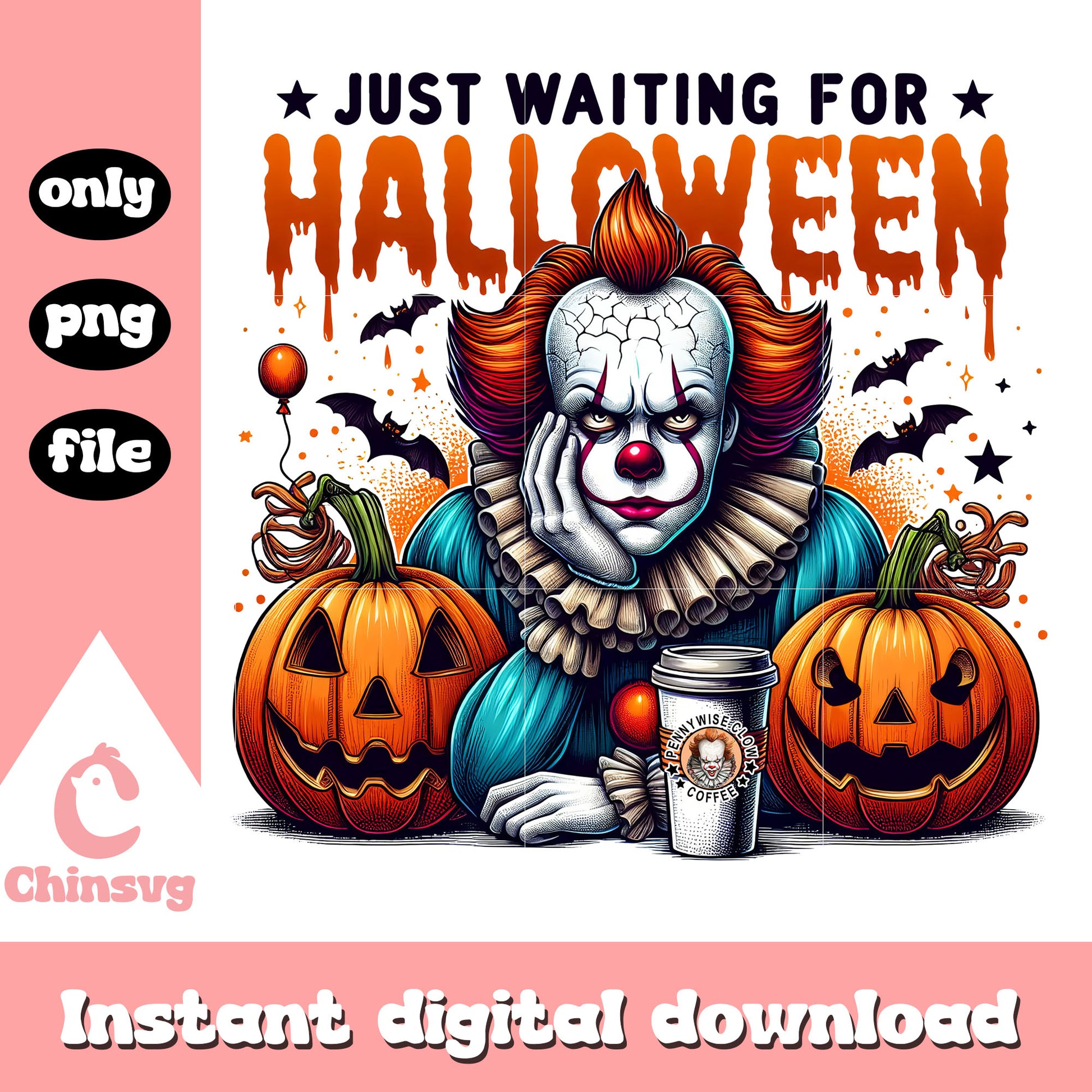 Pennywise just waiting for halloween png is a product of our Halloween collection. Whether you're crafting spooky decorations, designing party invitations, or creating unique apparel, this collection is packed with high-quality, detailed graphics that perfectly capture the spirit of Halloween. From pumpkins, ghosts, bats, to witches, skeletons, and more, this set offers endless possibilities for your creative ideas.