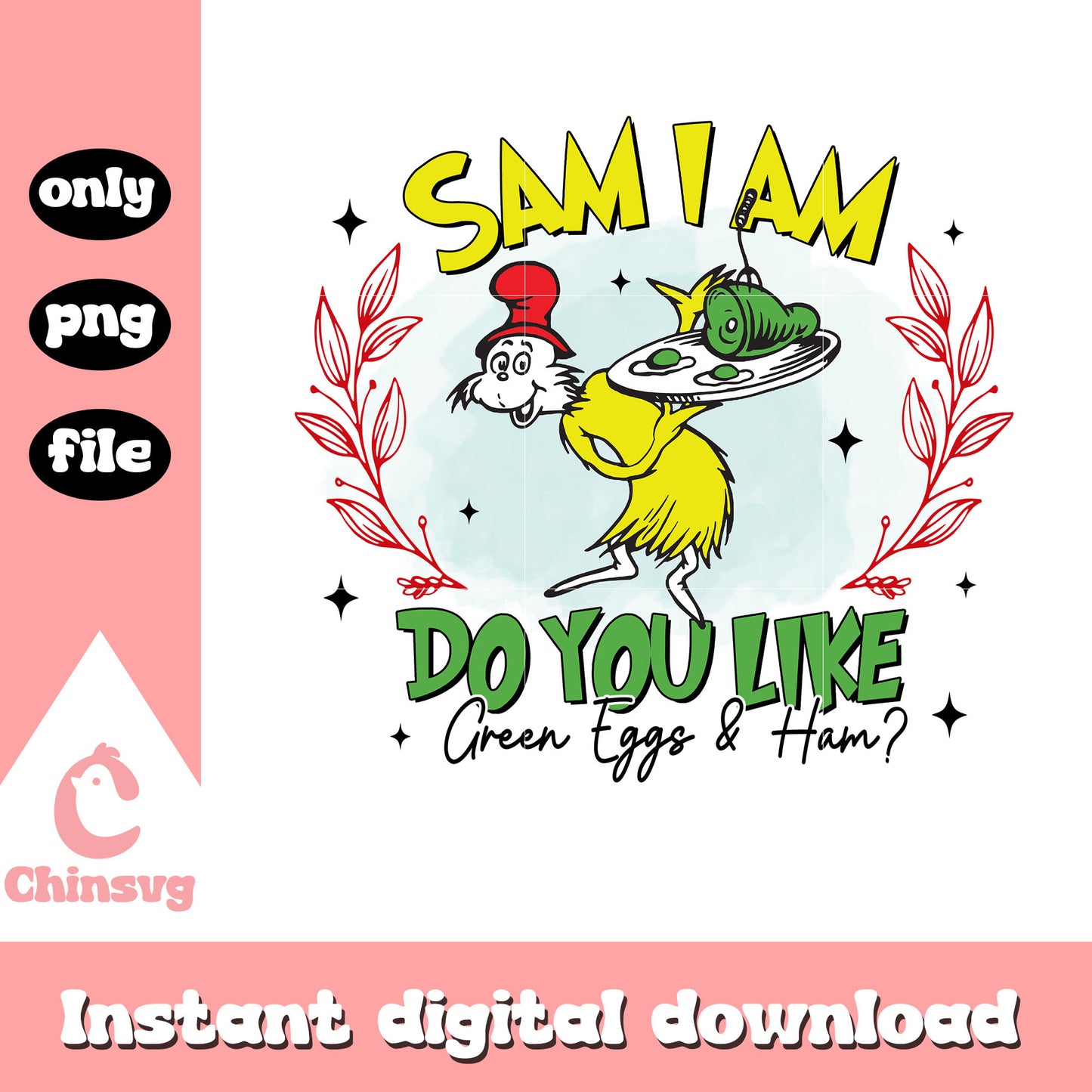 Sam I am do you like green eggs and ham png is a product of our Dr seuss collection. inspired by the beloved books and characters that have enchanted generations! Featuring iconic designs of The Cat in the Hat, Horton, Thing 1 & Thing 2, and more, along with memorable quotes and whimsical elements, this collection is perfect for crafting unique projects that spark joy and creativity.