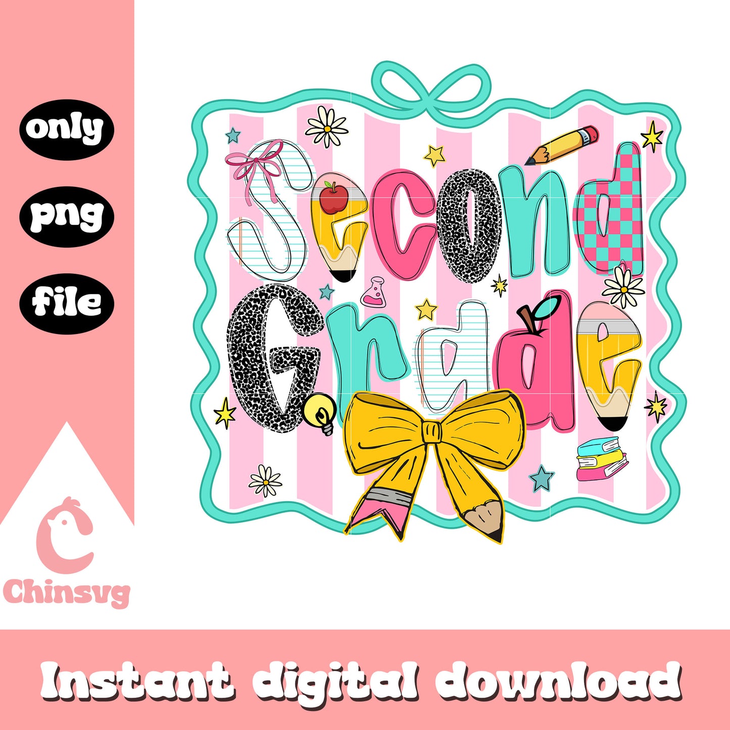 Second grade back to school coquette png is a product of our School collection. Celebrate the spirit of learning with our School SVG Collection! Perfect for teachers, students, and parents, this collection features education-themed designs, from playful quotes and school supplies to classroom graphics and seasonal school moments. Whether you're personalizing a teacher gift or decorating for back-to-school, these high-quality files bring creativity to every classroom and craft project!