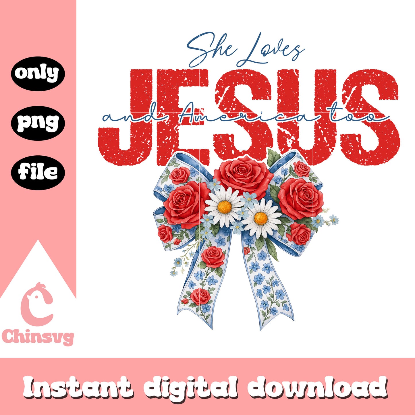 She loves Jesus america rose bow png is a product of our 4th of July collection. Get ready to celebrate America’s Independence Day in style with our 4th of July SVG Collection! Packed with bold red, white, and blue designs, this collection features patriotic graphics, fun quotes, fireworks, flags, and more. Perfect for DIY apparel, party decorations, and personalized gifts that light up the holiday spirit!
