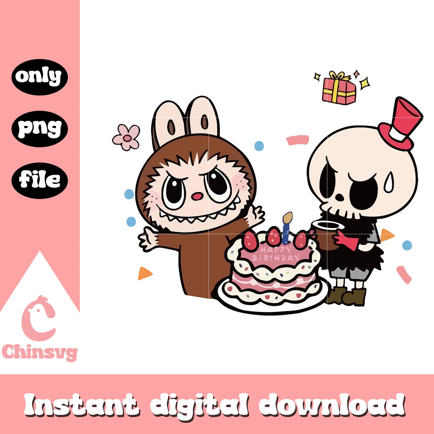 Skull birthday and labubu cute doll design png, labubu dolls png