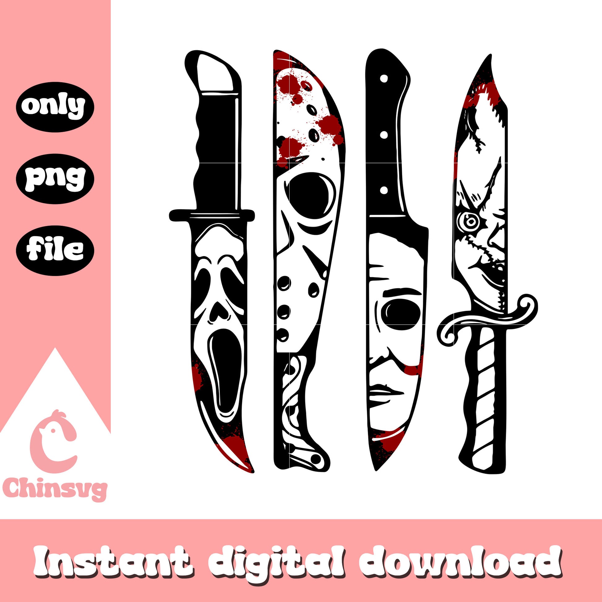 Spooky characters movie knife art design png is a product of our Halloween collection. Whether you're crafting spooky decorations, designing party invitations, or creating unique apparel, this collection is packed with high-quality, detailed graphics that perfectly capture the spirit of Halloween. From pumpkins, ghosts, bats, to witches, skeletons, and more, this set offers endless possibilities for your creative ideas.