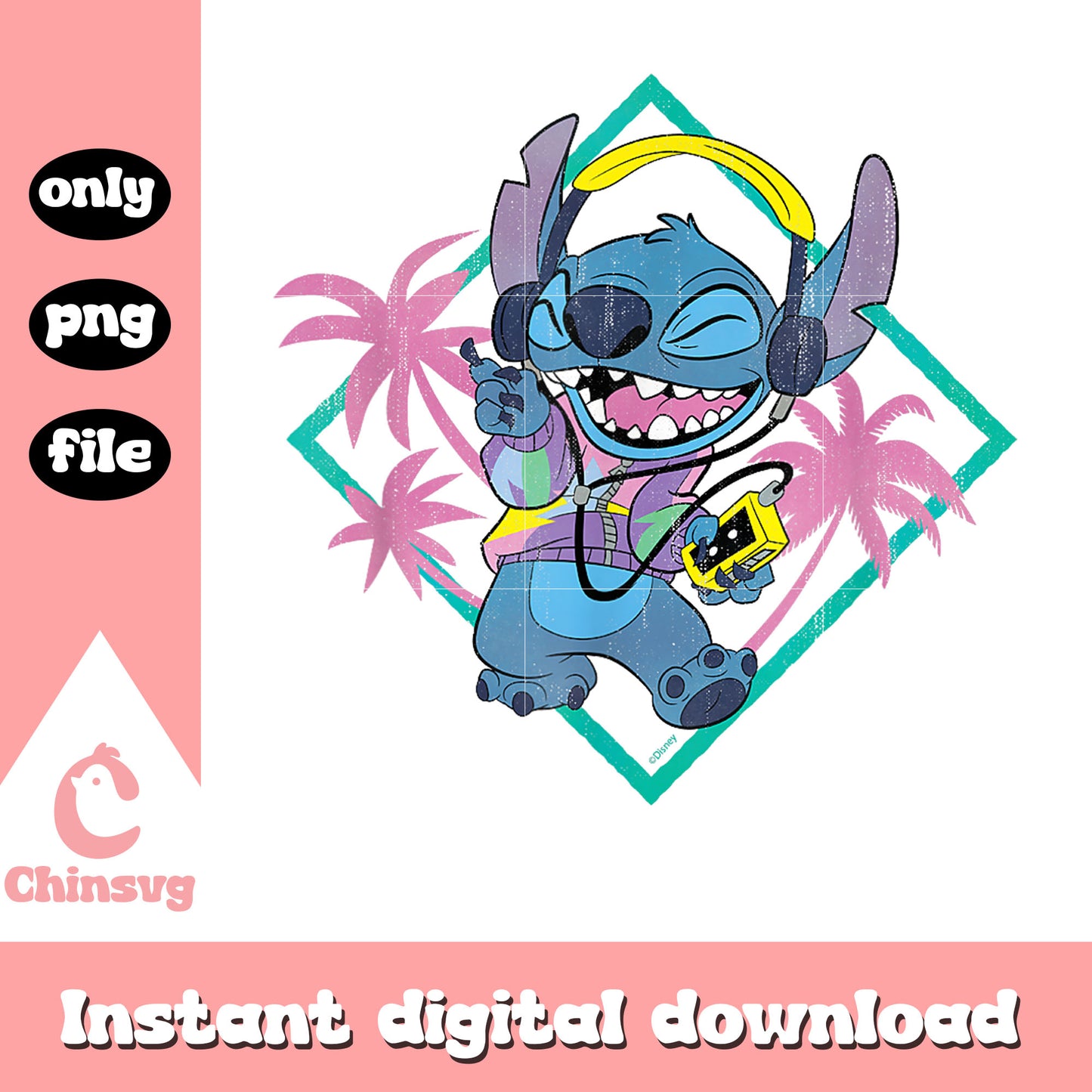 Stitch ‘90s music Vibe Retro Distressed png is a product of our Disney collection. Perfect for Disney fans of all ages, this collection captures the charm and nostalgia of your favorite characters and magical worlds. Featuring a range of beloved characters, castles, magical icons, and whimsical designs, these files are ideal for creating everything from custom apparel to party decorations and personalized gifts.