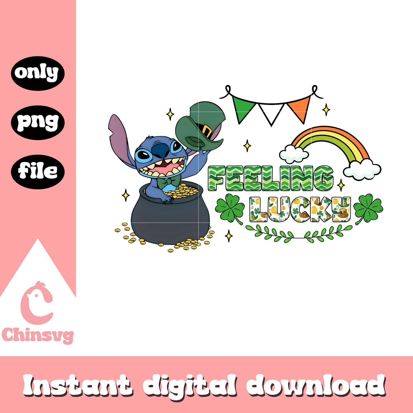 Stitch feeling lucky png is a product of our St patrick's day collection. Packed with festive designs, this collection features lucky clovers, leprechauns, rainbows, hats, mugs of beer, and all things green and gold. Perfect for crafting custom decorations, apparel, and gifts, these high-quality files are ideal for adding a touch of Irish cheer to your creative projects.