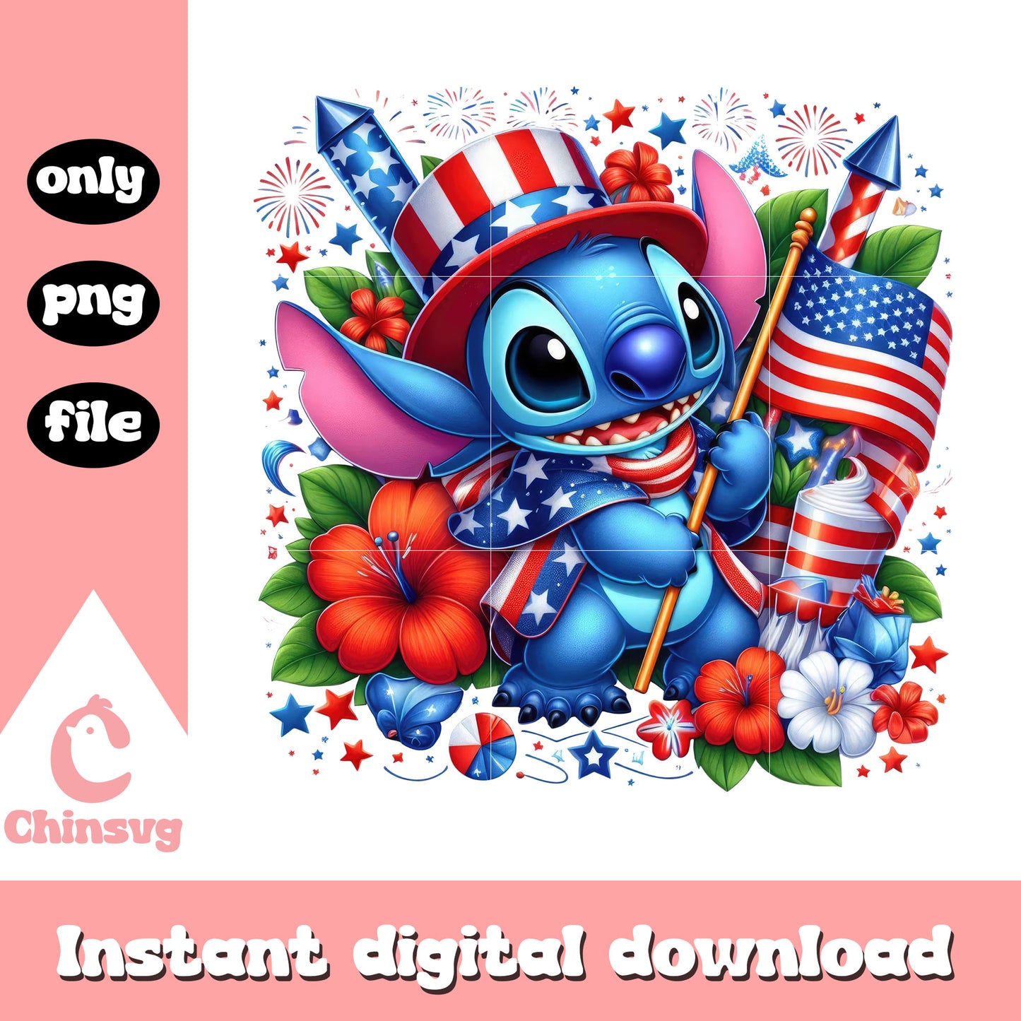 Stitch holding usa day flag hibiscus png, stitch 4th of july png
