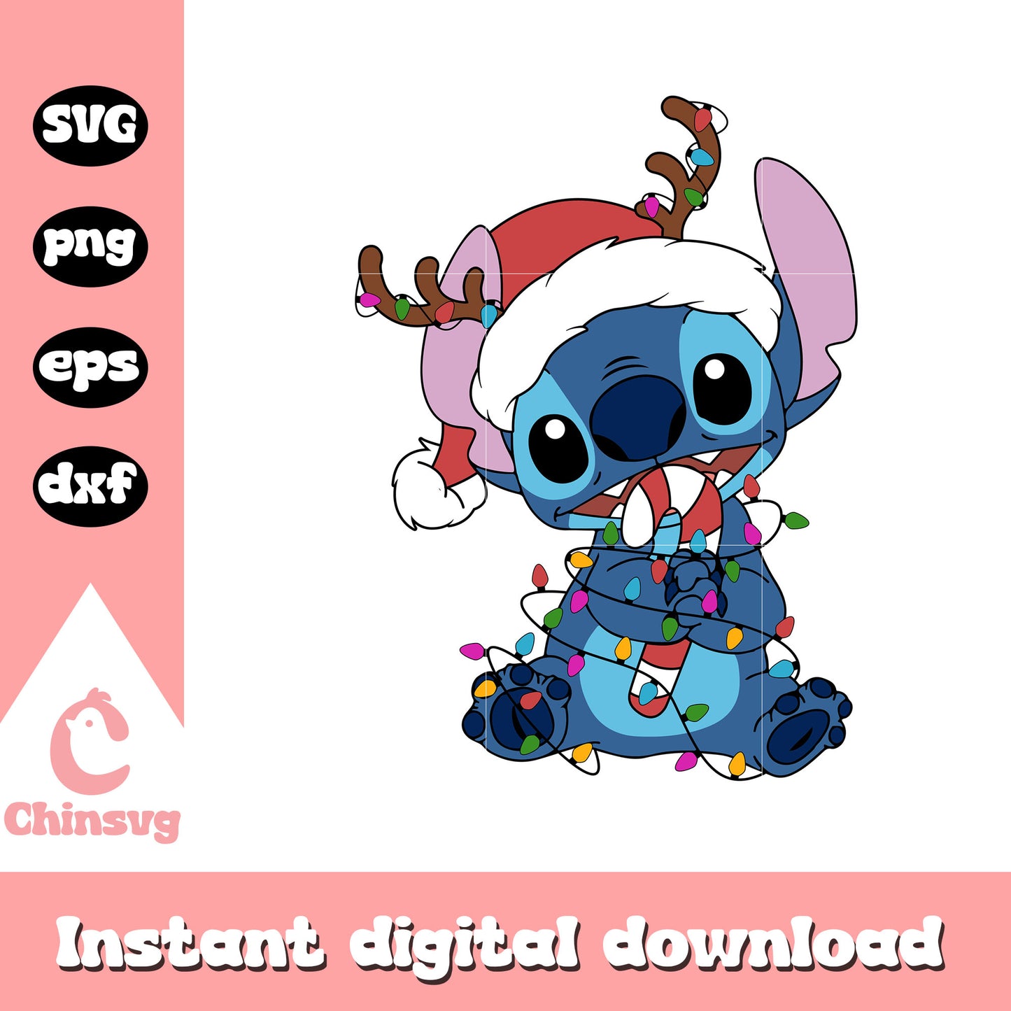 Stitch reindeer christmas lights svg, stitch santa hat svg