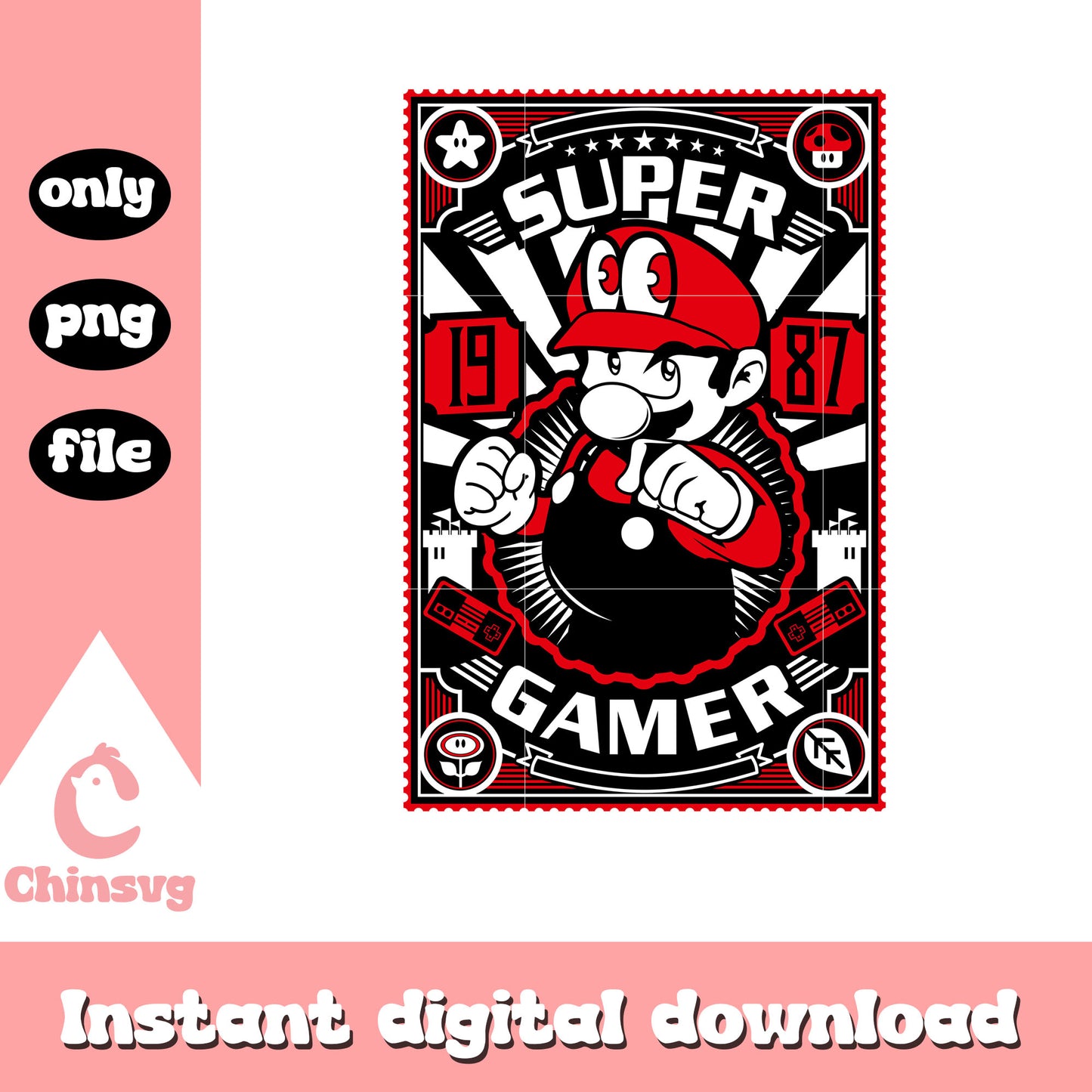 Super gamer 1987 mario character png is a product of our Mario collection. Featuring iconic characters, power-ups, fun quotes, and retro gaming elements, this collection is perfect for gamers, kids, and Nintendo fans. Whether you're creating custom apparel, party decorations, or DIY gifts, these high-quality SVG designs will bring a nostalgic and playful touch to your projects!