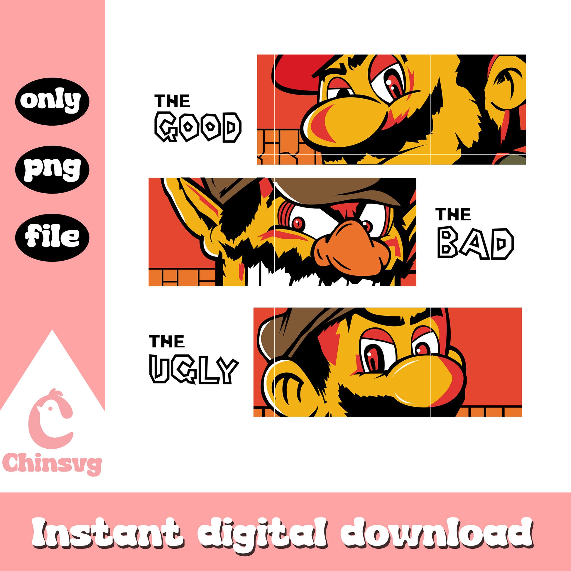 The good the bad the ugly png is a product of our Mario collection. Featuring iconic characters, power-ups, fun quotes, and retro gaming elements, this collection is perfect for gamers, kids, and Nintendo fans. Whether you're creating custom apparel, party decorations, or DIY gifts, these high-quality SVG designs will bring a nostalgic and playful touch to your projects!