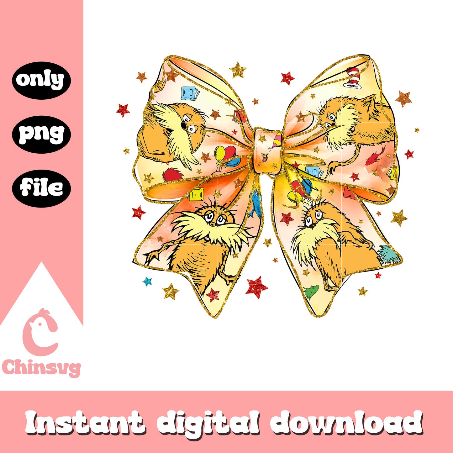 The lorax character bow png is a product of our Dr seuss collection. inspired by the beloved books and characters that have enchanted generations! Featuring iconic designs of The Cat in the Hat, Horton, Thing 1 & Thing 2, and more, along with memorable quotes and whimsical elements, this collection is perfect for crafting unique projects that spark joy and creativity.