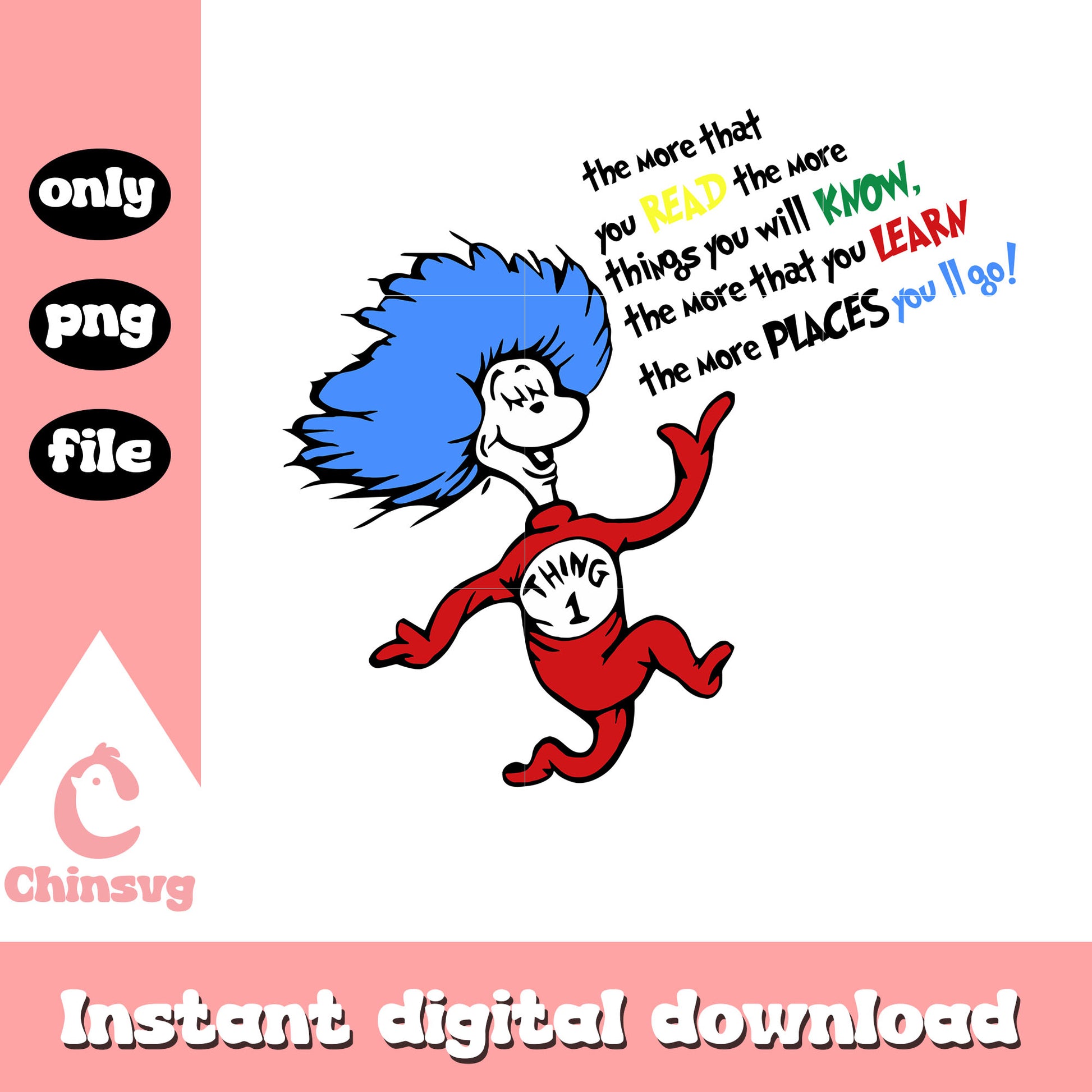 The more that you read the more things you will know png is a product of our Dr seuss collection. inspired by the beloved books and characters that have enchanted generations! Featuring iconic designs of The Cat in the Hat, Horton, Thing 1 & Thing 2, and more, along with memorable quotes and whimsical elements, this collection is perfect for crafting unique projects that spark joy and creativity.