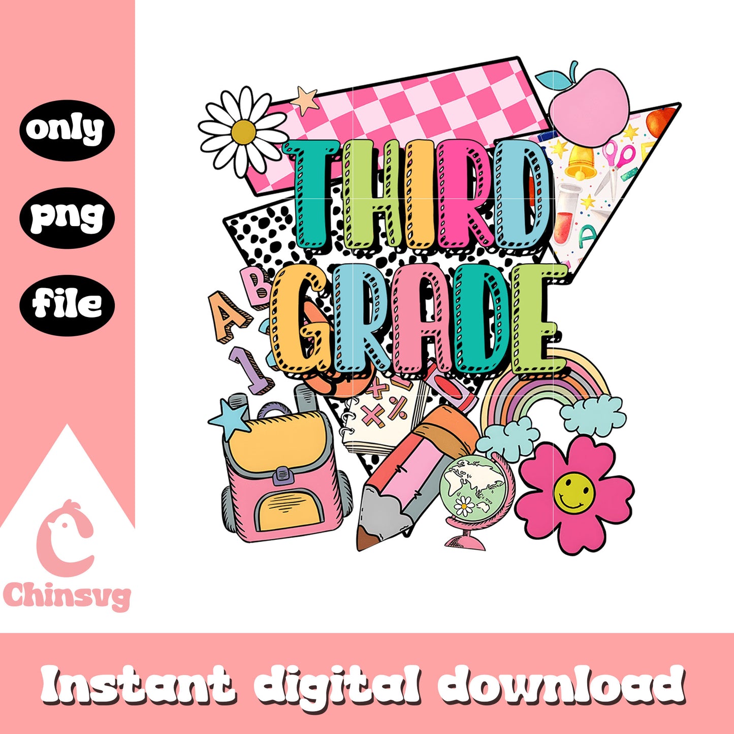 Third grade back to school clipart png is a product of our School collection. Celebrate the spirit of learning with our School SVG Collection! Perfect for teachers, students, and parents, this collection features education-themed designs, from playful quotes and school supplies to classroom graphics and seasonal school moments. Whether you're personalizing a teacher gift or decorating for back-to-school, these high-quality files bring creativity to every classroom and craft project!