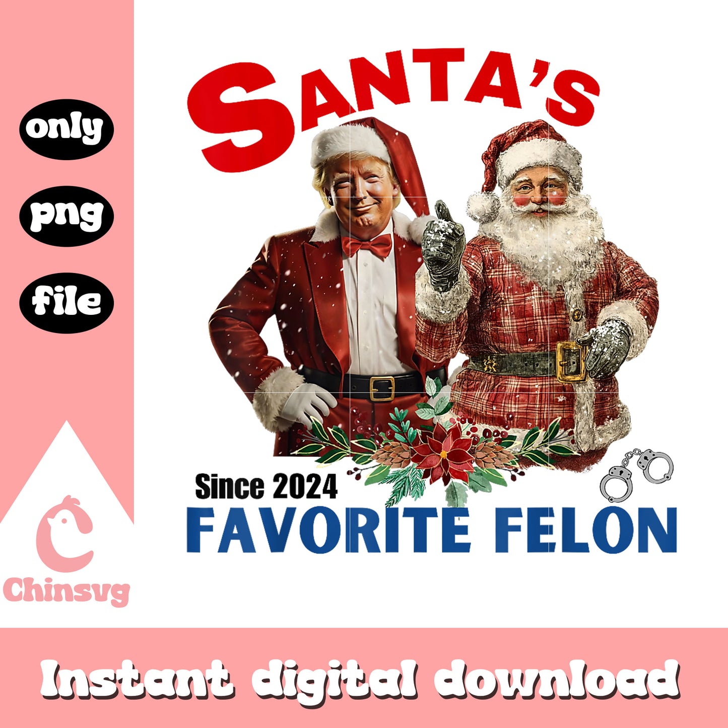 Trump santa favorite felon since 2024 png is a product of our christmas collection. Perfect for DIY enthusiasts, crafters, and designers, this collection offers a wide range of festive elements like Christmas trees, Santa Claus, snowflakes, ornaments, reindeer, and more. Whether you’re designing greeting cards, personalized gifts, or home decor, these high-quality designs will help you create something truly special this Christmas.