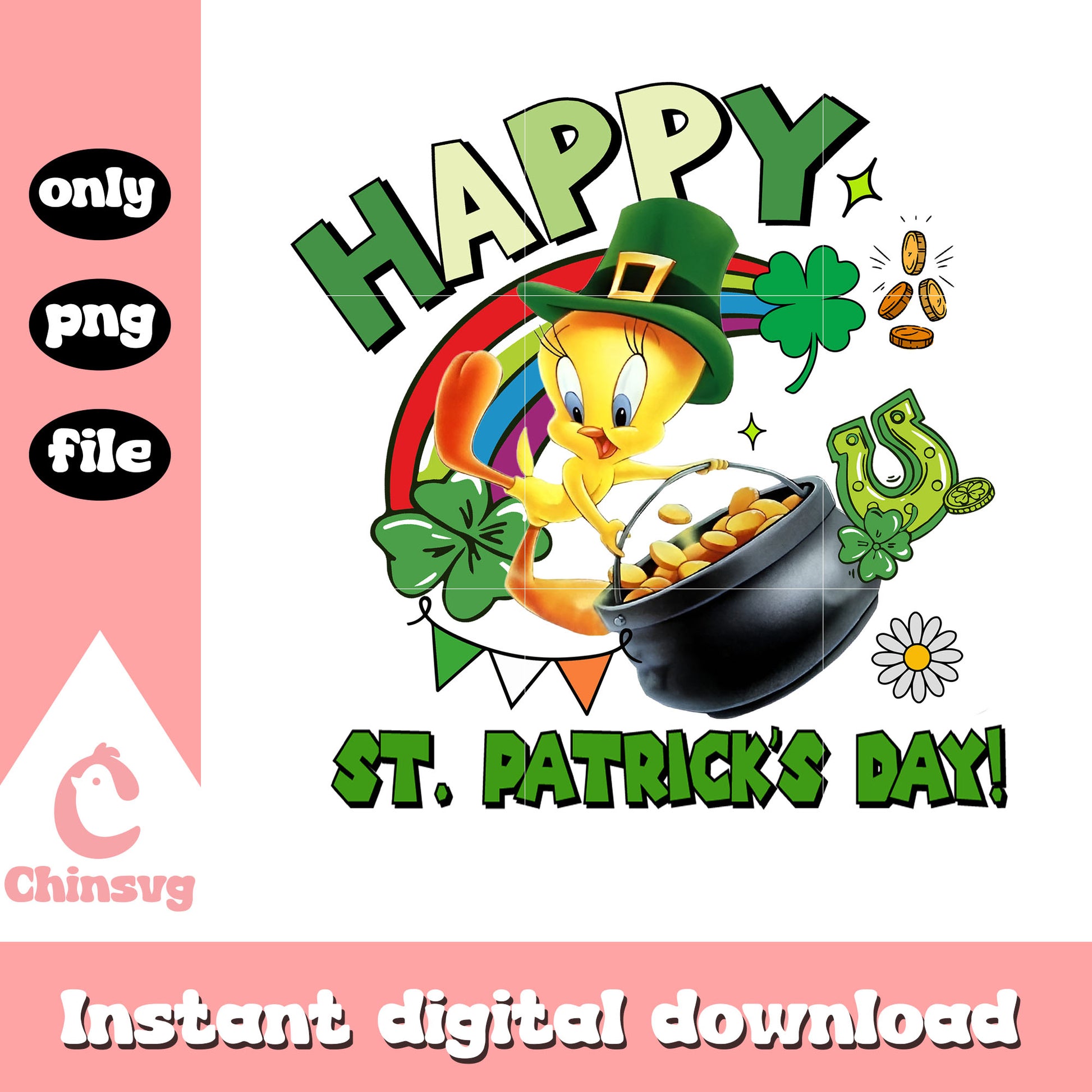 Tweety happy st.patrick's day png is a product of our St patrick's day collection. Packed with festive designs, this collection features lucky clovers, leprechauns, rainbows, hats, mugs of beer, and all things green and gold. Perfect for crafting custom decorations, apparel, and gifts, these high-quality files are ideal for adding a touch of Irish cheer to your creative projects.