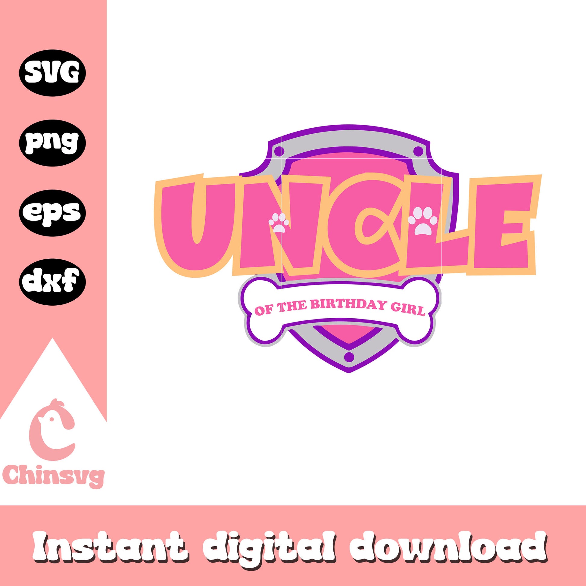 Uncle of the birthday girl svg is a product of our Paw patrol collection. Featuring Chase, Marshall, Skye, Rubble, Zuma, Rocky, and Everest, along with paw prints, badges, and rescue-themed elements, this collection is perfect for creating playful and adventurous designs. Whether you’re crafting for birthdays, kids’ apparel, or themed decorations, these high-quality designs will make your projects Paw-some!