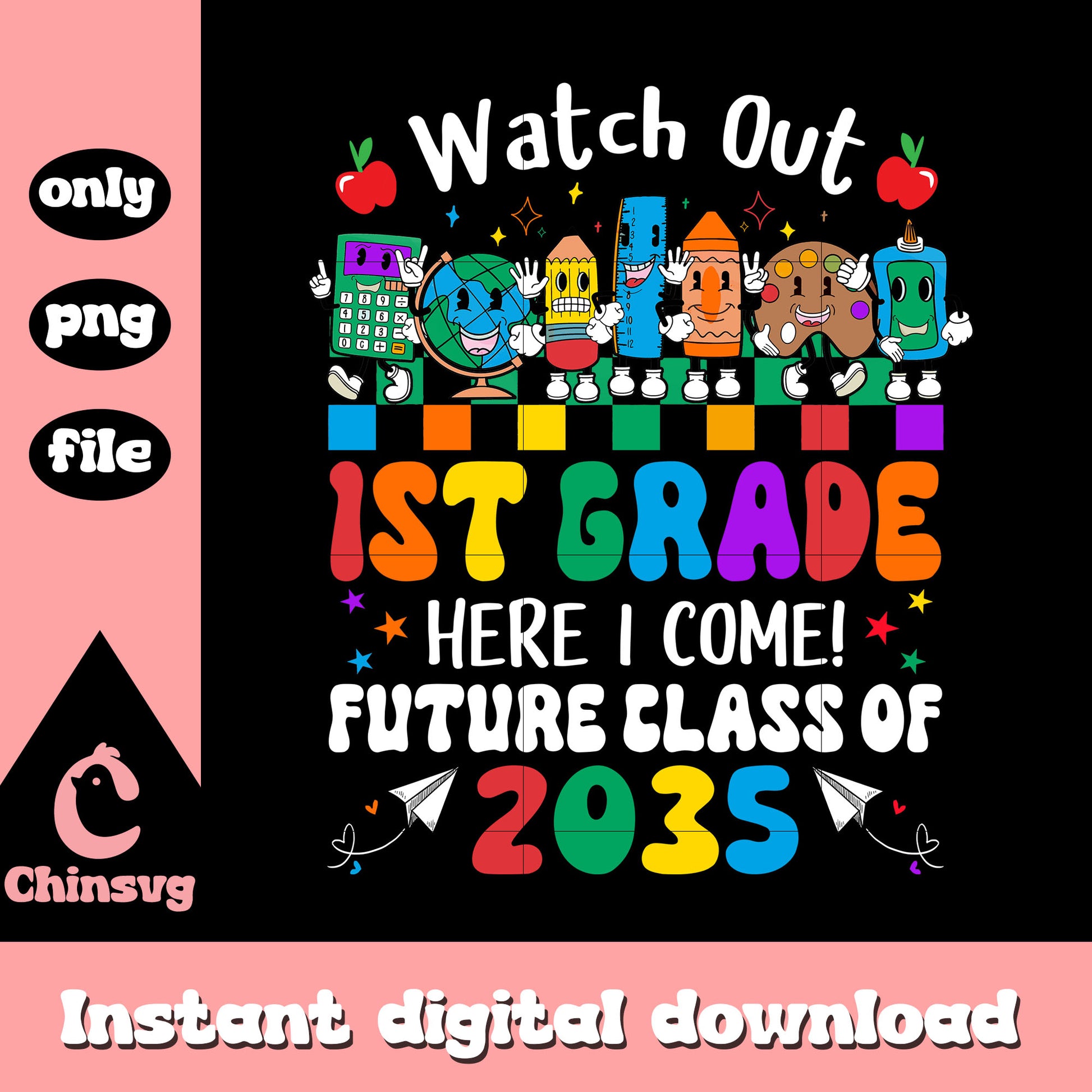 Watch out 1st grade here i come future class of 2035 png is a product of our School collection. Celebrate the spirit of learning with our School SVG Collection! Perfect for teachers, students, and parents, this collection features education-themed designs, from playful quotes and school supplies to classroom graphics and seasonal school moments. Whether you're personalizing a teacher gift or decorating for back-to-school, these high-quality files bring creativity to every classroom and craft project!
