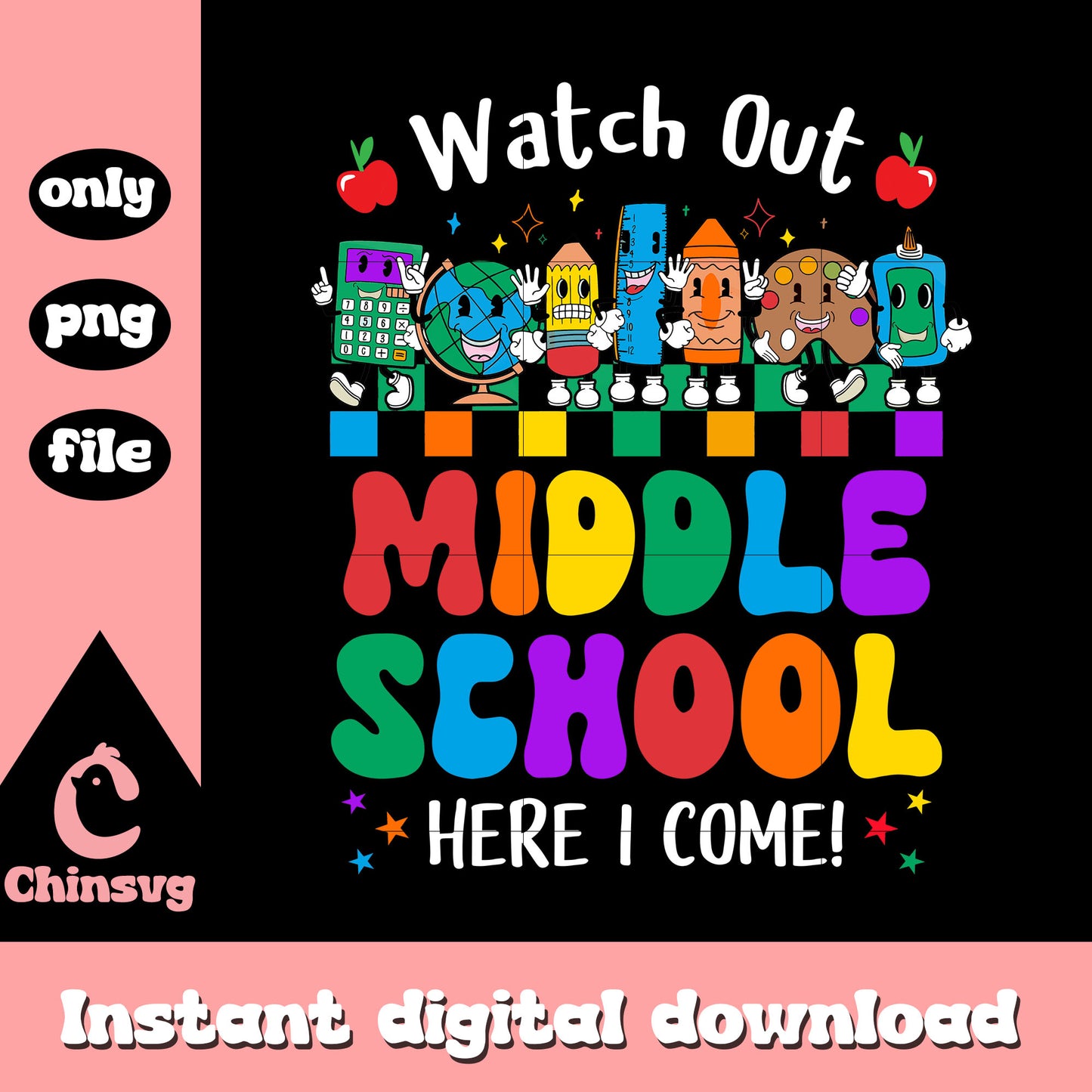 Watch out middle school here i come design png is a product of our School collection. Celebrate the spirit of learning with our School SVG Collection! Perfect for teachers, students, and parents, this collection features education-themed designs, from playful quotes and school supplies to classroom graphics and seasonal school moments. Whether you're personalizing a teacher gift or decorating for back-to-school, these high-quality files bring creativity to every classroom and craft project!