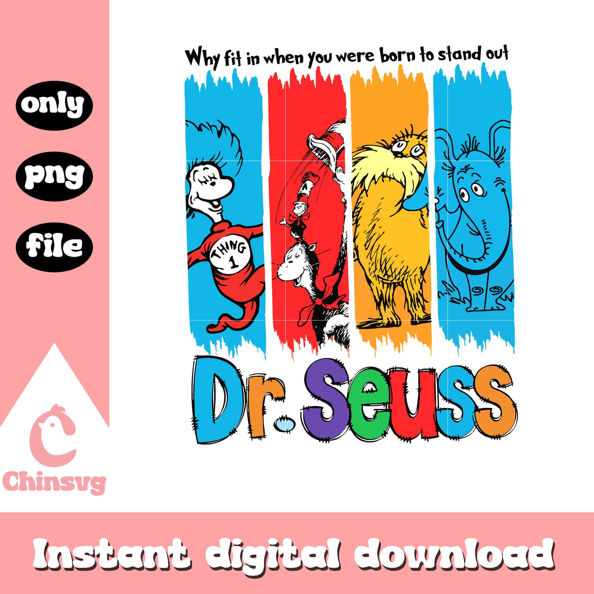 Why fit in when you were born to stand out png is a product of our Dr seuss collection. inspired by the beloved books and characters that have enchanted generations! Featuring iconic designs of The Cat in the Hat, Horton, Thing 1 & Thing 2, and more, along with memorable quotes and whimsical elements, this collection is perfect for crafting unique projects that spark joy and creativity.